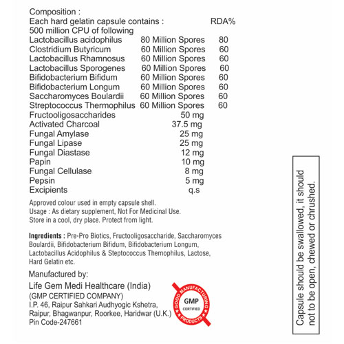 Lactobacillus Acidophilus 80 million spores Colstridium Bulrlicum 60 million spores + Lactobacilus Rhamnosus 60 million spores + Lactobacilus Sporogenes 60 million spores + Bifidobacterium Bifidum 60 million spores Bifidobacterium Longum 60 million spores + Steptococcus Boulardi 60 million spores + Steptococcus Thermophilus 60 million spores + Fructo-Oligo Saccharides 50gm +Activated Charchol 37.5 mg Fungal Amylese 25 mg