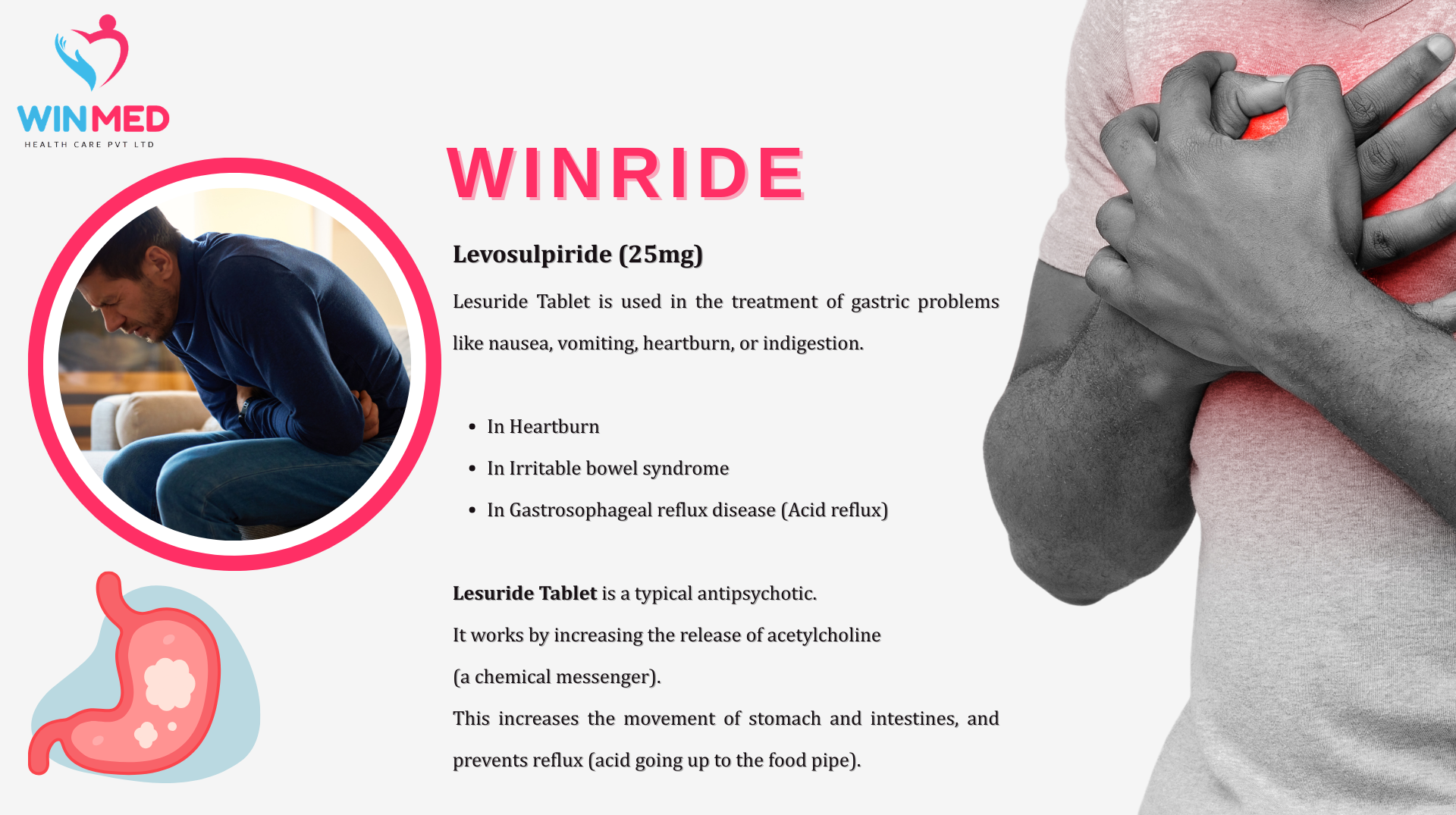 Winride Tablet is a common antipsychotic medication. It functions by causing acetylcholine, a chemical messenger, to be released more frequently. By doing this, reflux is avoided (acid flowing up to the food pipe) and the stomach and intestines move more freely.
