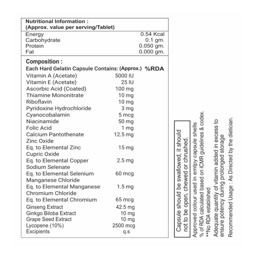 Gingseng 42.5 mg, Ginkgo Biloba 10mg, Grape Seed Extract 10mg, CAPSULES Lycopene 2500 mcg, Vitamin A 5000 IU, Vitamin E 25 IU & Minerals